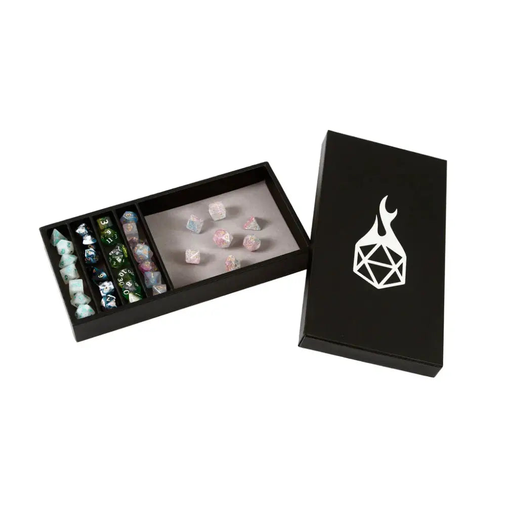 Dual purpose rolling tray and storage. holds up to 100 standard polyhedral dice. lid comes off and can be used as another rolling tray