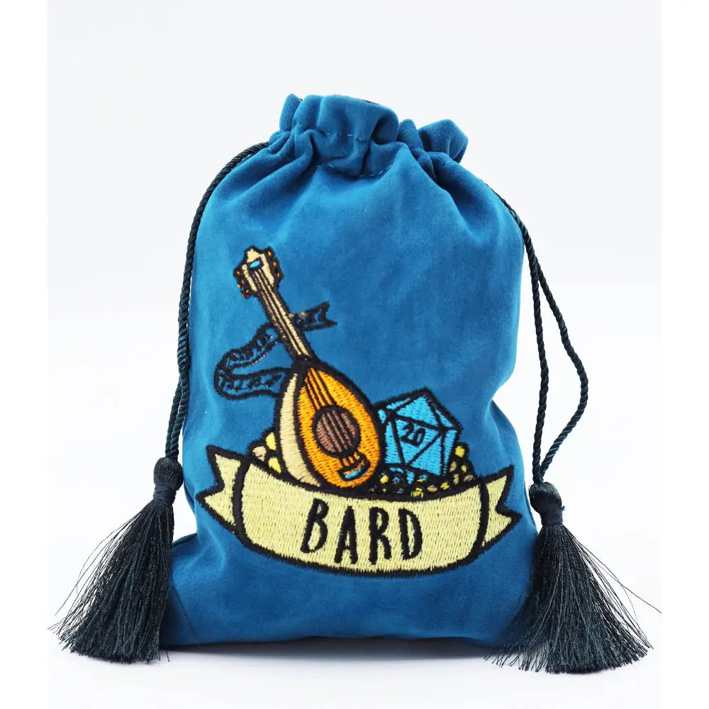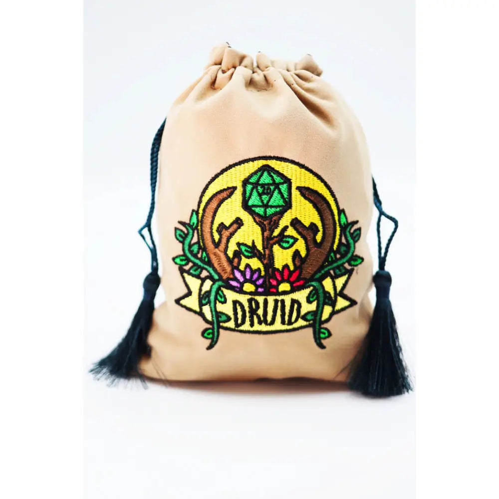 This dice bag is big enough to hold several sets of dice while not being bulky. It has an embroidered design on faux suede with a drawstring closure.