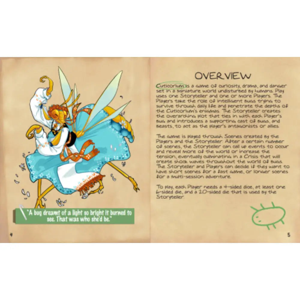 Cuticorium uses a GM/Storyteller, 1-5 players, and d4 dice. It can be played in short one-shots or multi-session campaigns. There is also solo-journaling play with twelve detailed Ommatidia tables for randomly generating bug characters. The PDF incudes access to character sheets, the double sided high-res map, and an ambient nine track original musical score to set the mood.