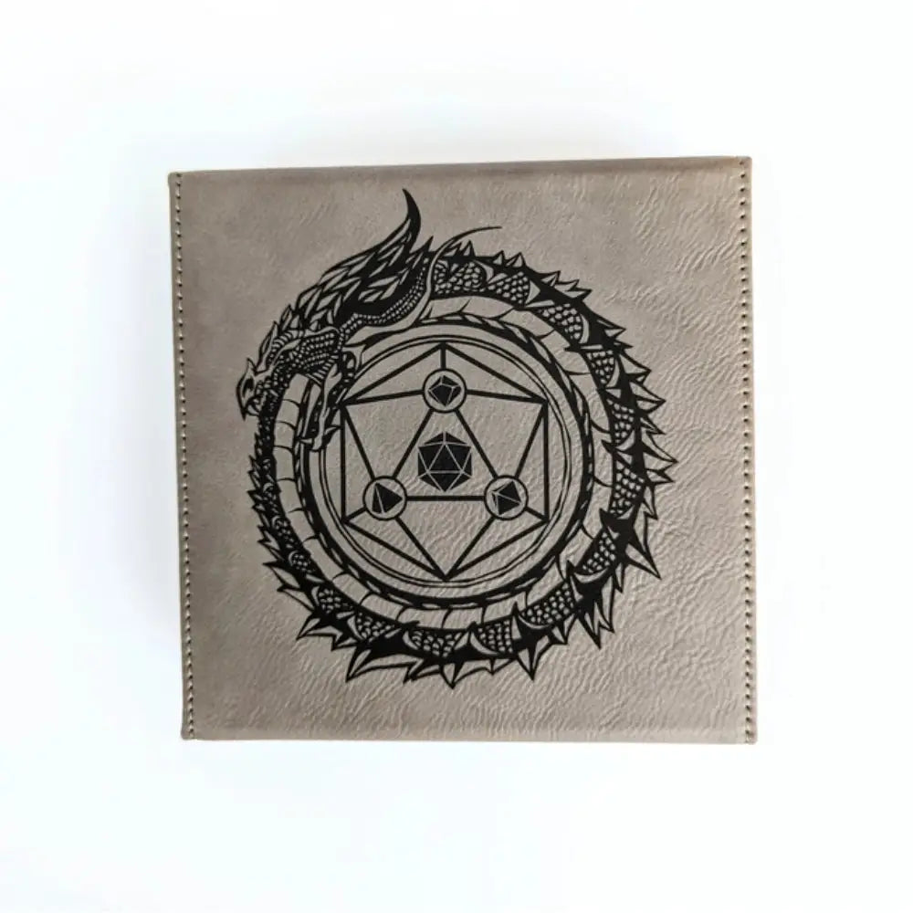 Feed your inner dice goblin and upgrade your dice game with this sturdy vegan leather wrapped dice box! Impress your friends at your next Dungeons and Dragons, Pathfinder, or other tabletop session when you break out this gorgeous dice box. This box holds multiple sets of dice, as well as doubling as an attractive dice tray to prevent your rolls from getting too wild.