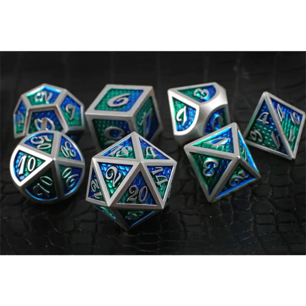 Forged Gaming Company is committed to providing the highest quality gaming accessories. These heavy duty polyhedral dice are made of SOLID metal, yes, they are literally, Heavy. Metal. dice. Whether you're rolling for the win or chucking them at a kobold to defend your party these dice are right for the job. Just don't really throw them. They're heavy...They hurt. This set is polished silver outlining a field of blended blue and green dragon scales.