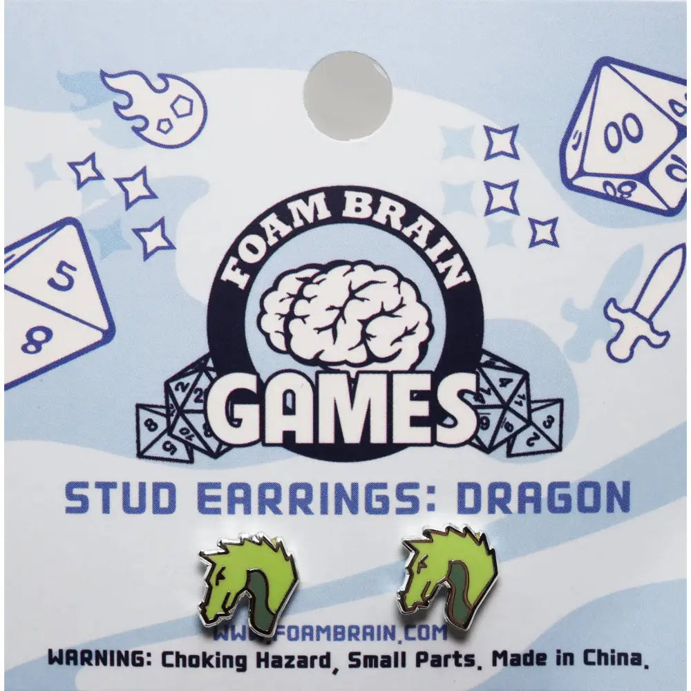 A pair of stud earrings featuring a green dragon head. These earrings are Silver Plated (safe for nickel allergies).