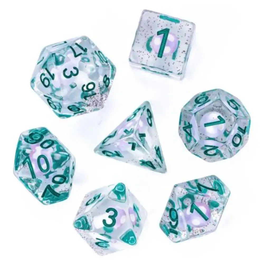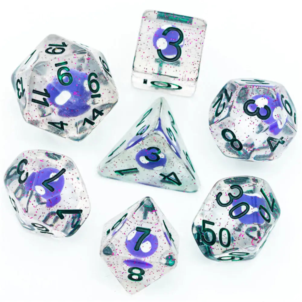 7-piece set of polyhedral dice, commonly used for RPGs such as Dungeons & Dragons, Pathfinder, and Savage Worlds. Includes 1 each of: d4, d6, d8, d10, d00, d12, and d20.