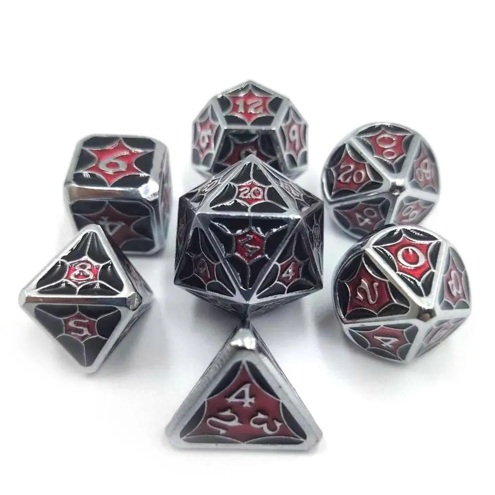 7-piece set of polyhedral dice, commonly used for RPGs such as Dungeons & Dragons, Pathfinder, and Savage Worlds. Includes 1 each of: d4, d6, d8, d10, d00, d12, and d20 plus black metal storage case.
