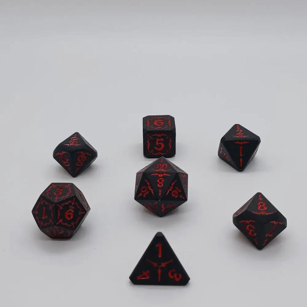 7-piece set of polyhedral dice, commonly used for RPGs such as Dungeons & Dragons, Pathfinder, and Savage Worlds. Includes 1 each of: d4, d6, d8, d10, d00, d12, and d20 plus black metal storage case.