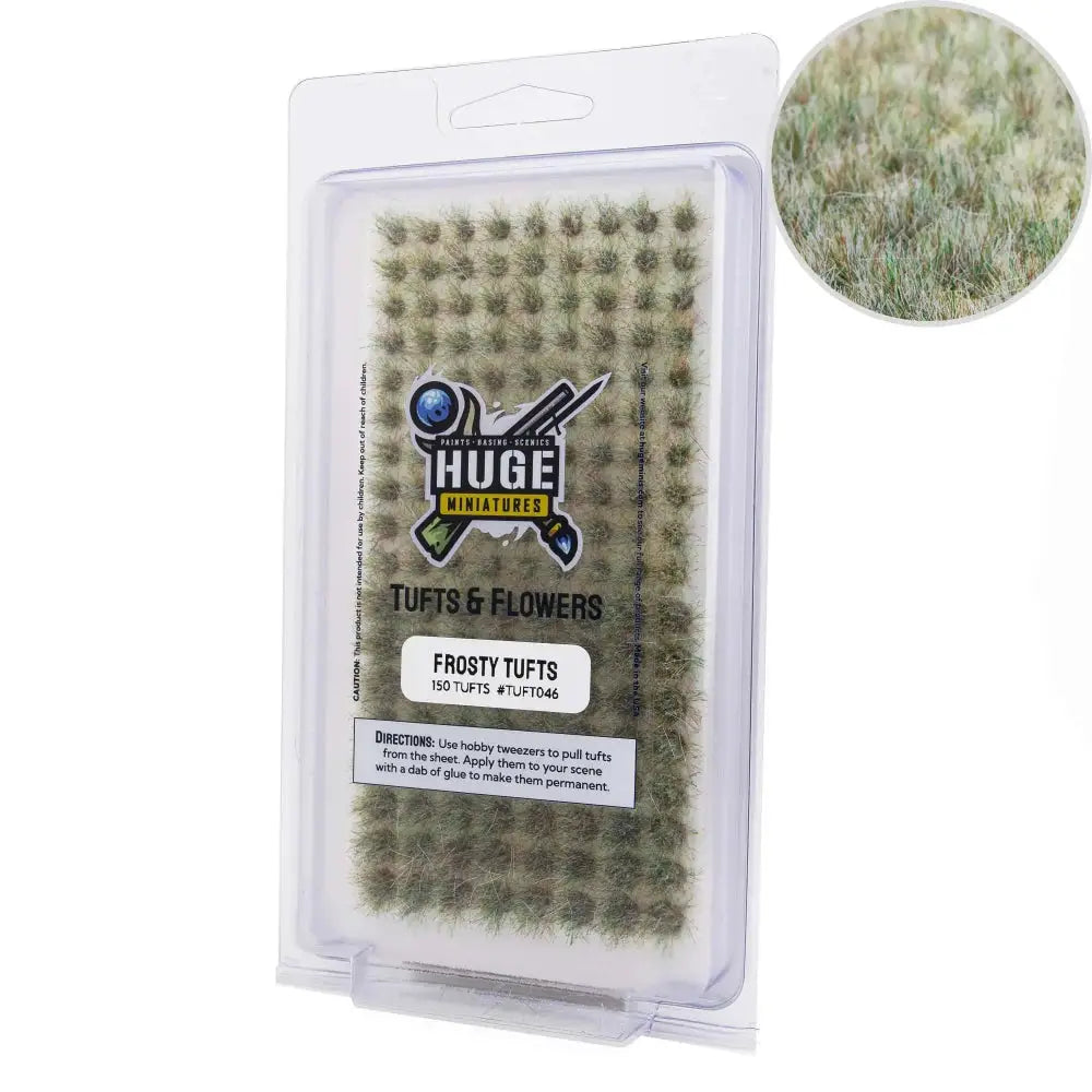 Each small sized tuft is approximately 3.5mm wide at the base and the large sized tufts are approximately 6mm wide at the base. They widen near the top of the tuft. Each pack contains 90 Small sized tufts and 64 Large sized tufts. They come in a resealable hard plastic clamshell container. These self adhesive tufts are simple to apply. A small dab of glue can provide extra staying power.
