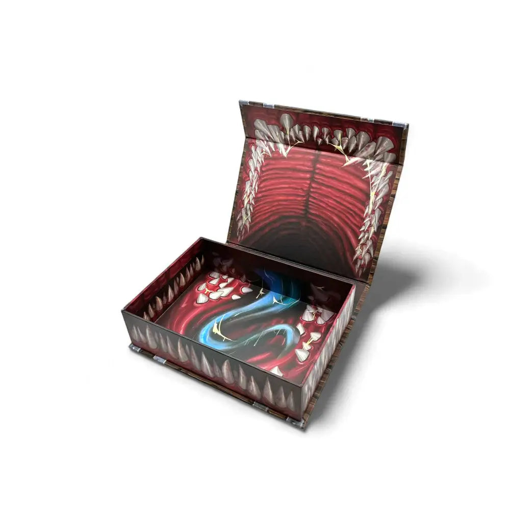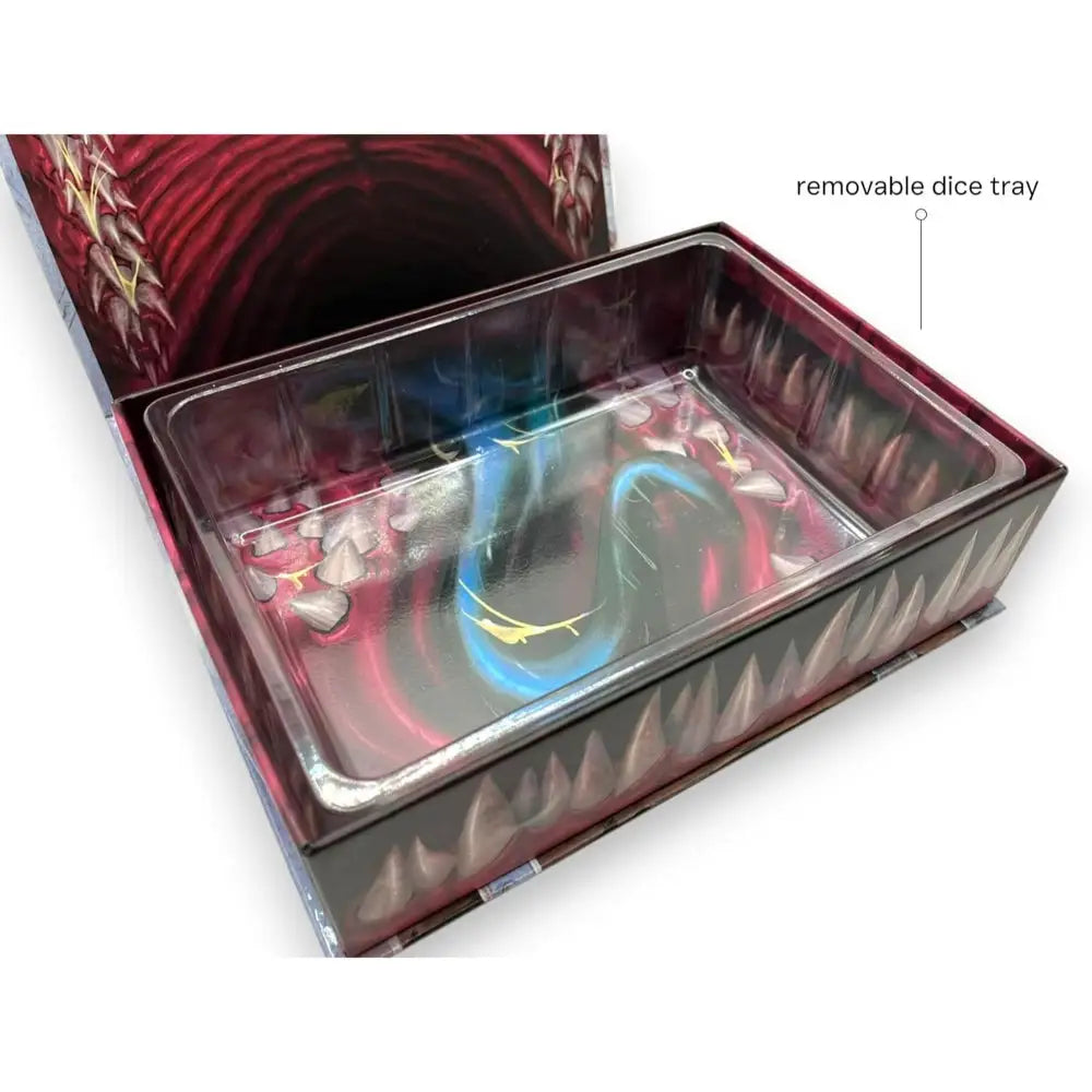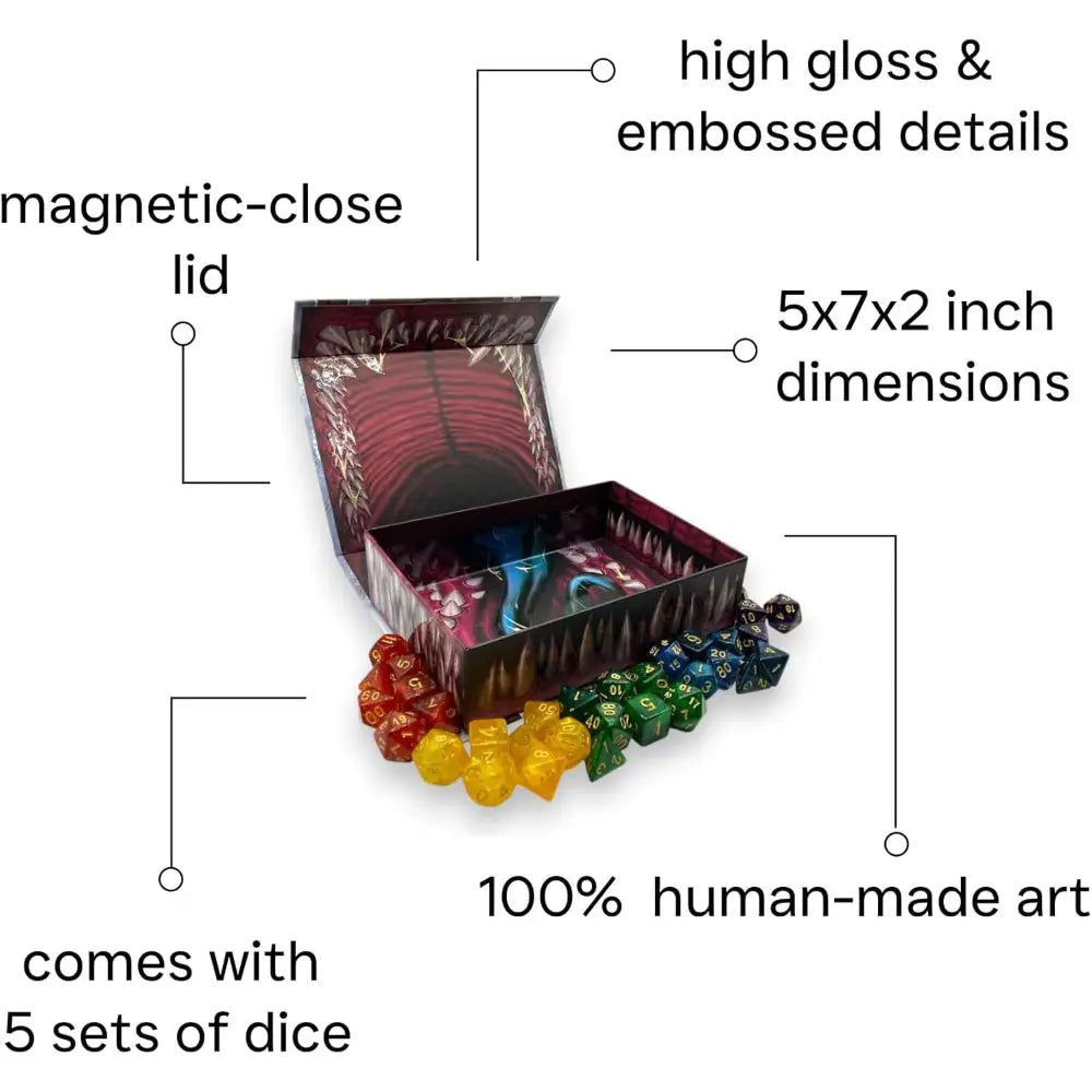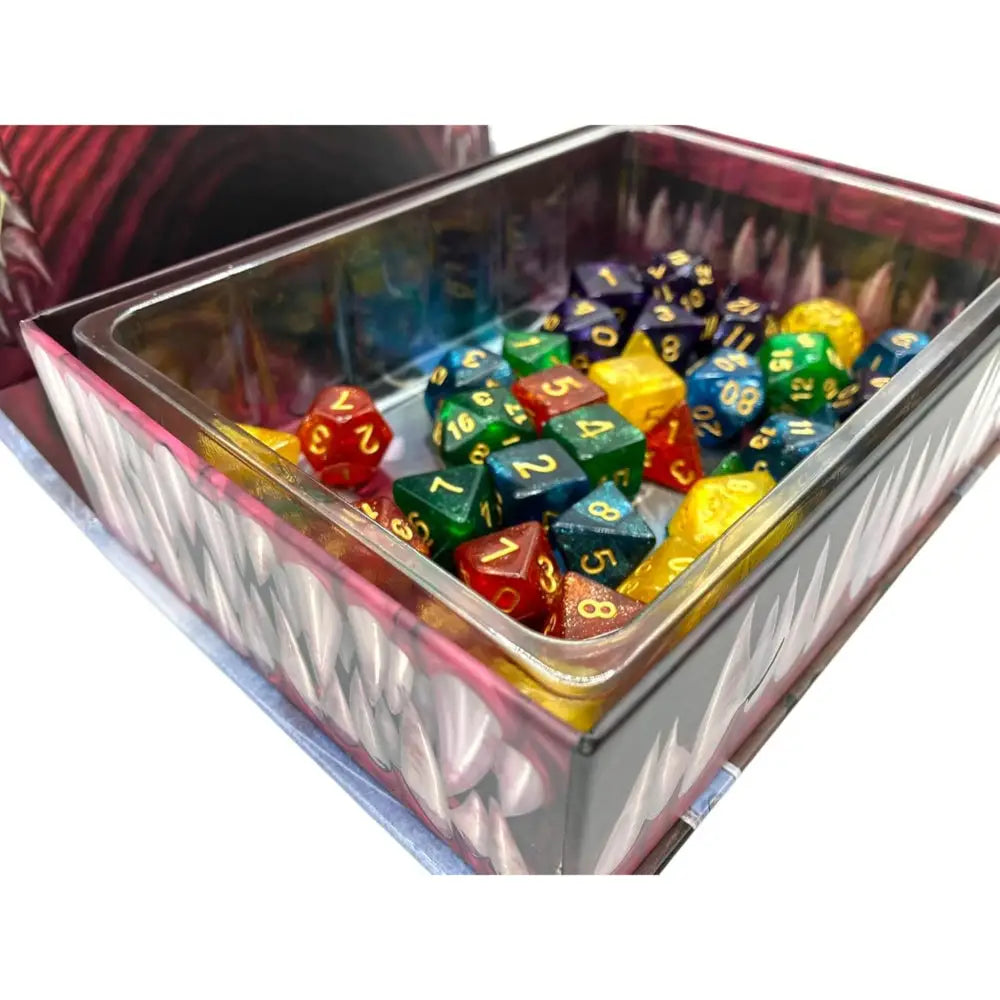The Mimic Chest features a gorgeous and terrifying mimic illustration inside and outside the box and comes with the Treasure Dice collection: 5 colored sets of 7 standard polyhedral RPG dice with di-color pantone swirls and silver glitter (35 dice total).