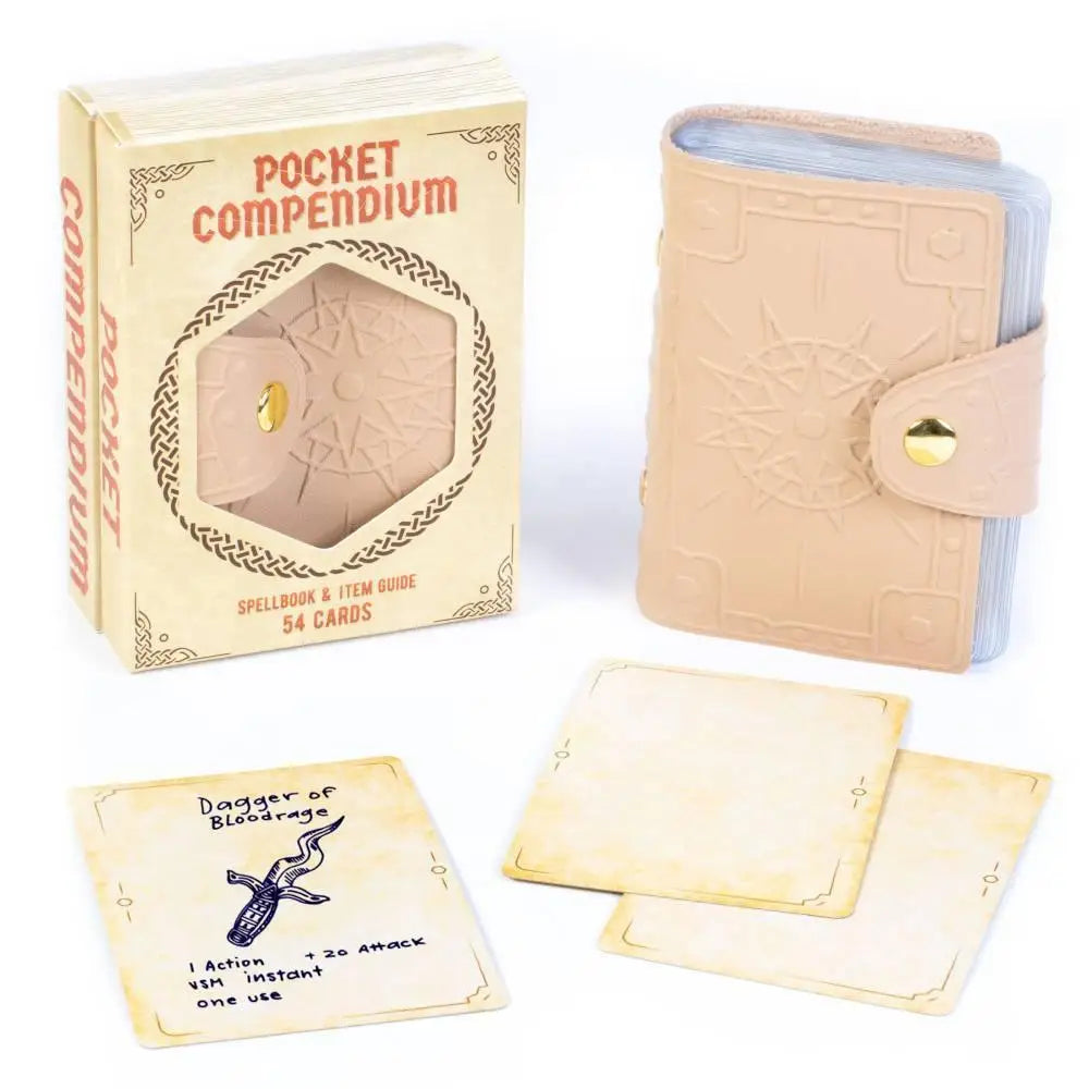 Impose order on tabletop chaos with a Pocket Compendium. Picked up a new spell? Write down the details on a card and slide it in. Bought a shiny new magic axe? Scribble down the stats, draw a quick pic, and slide it in. Traveling with a new NPC? You've got the idea. Customize your cards, add them to your compendium, and game on. The Pocket Compendium is also fully compatible with offical D&D 5th edition spell cards!