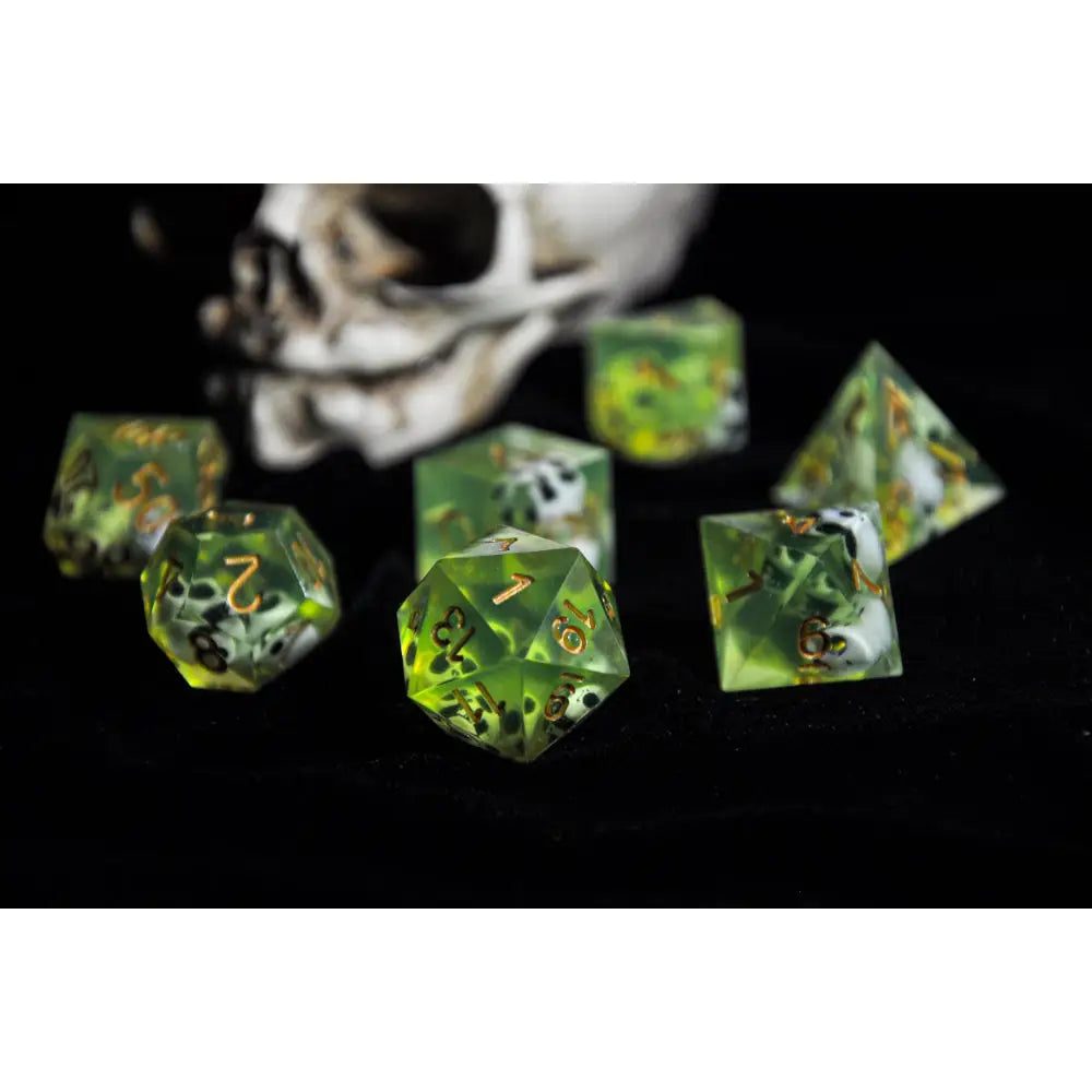 We all know of the infamous Gelatinous Cube, but did you know that they come in other shapes as well? These Gelatinous polyhedral resin dice are handmade and contain the little skulls of their unfortunate gloopy victims.