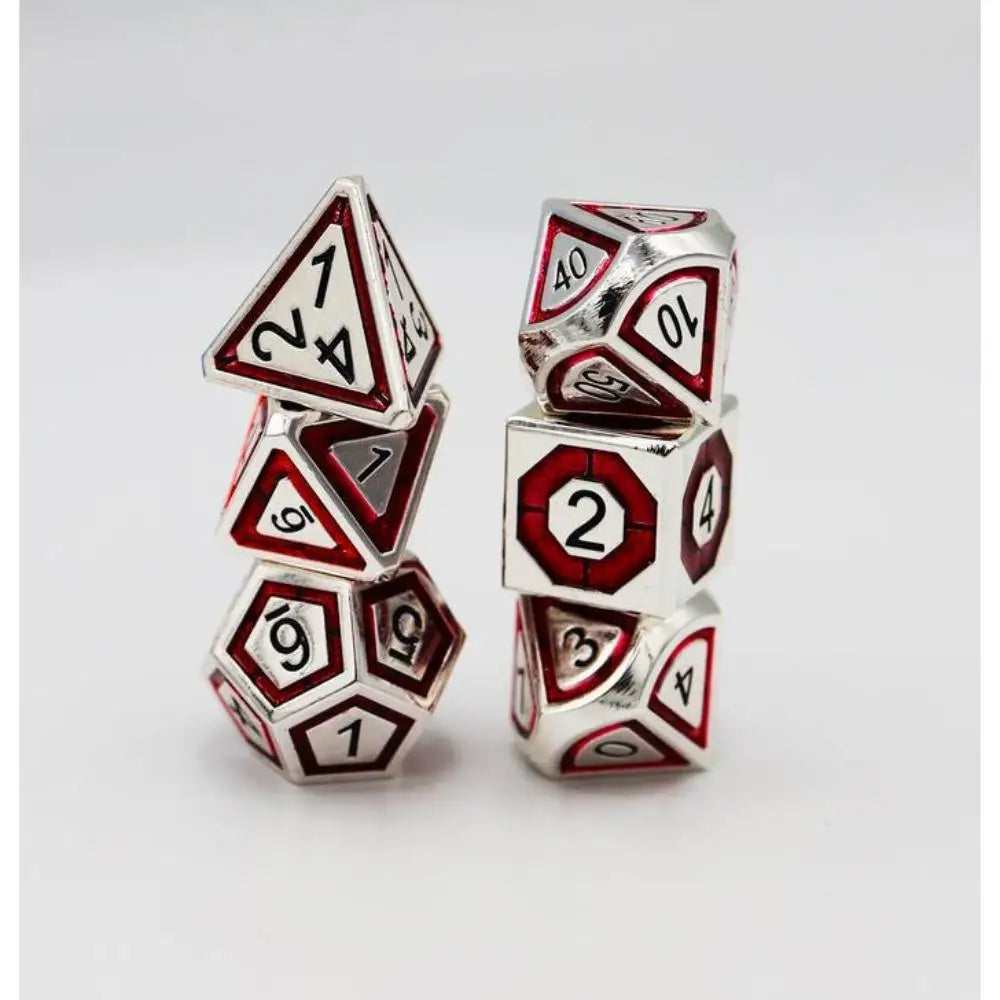 Foam Brain Metal Dice Set Embossed with Silver and Crimson Enamel with a Compass Design on the D6 Die