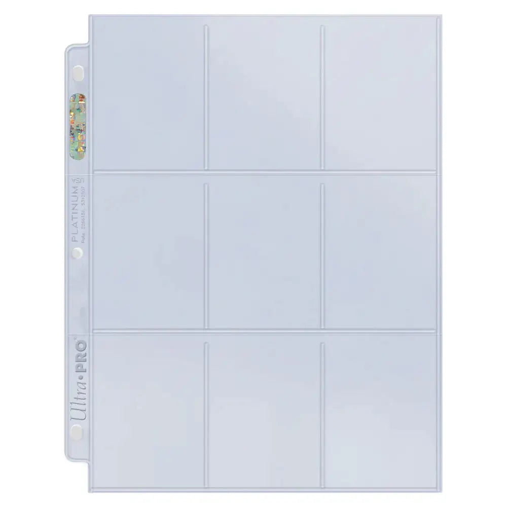 Protect and showcase your trading cards with the highest standard in safe storage - Ultra PRO's Platinum Series 9-Pocket Pages. Page's seals are solid sealed for high seal strength and improved lay-flat quality. Pockets are toploading style and sized to fit standard (2.5" x 3.5" trading cards, such as baseball cards, Pokemon and other collectible cards. Great for artists to archive sketch cards for display. Also ideal for sticker cards, coupons and other collectibles. Each page bears Ultra PRO's hologram quality & authenticity seal. Pages are clear on both sides and fit in Ultra PRO's standard-size 3-ring albums. Ultra PRO's Platinum Series pages are made in California, USA. Each box comes with 100 individual pages.