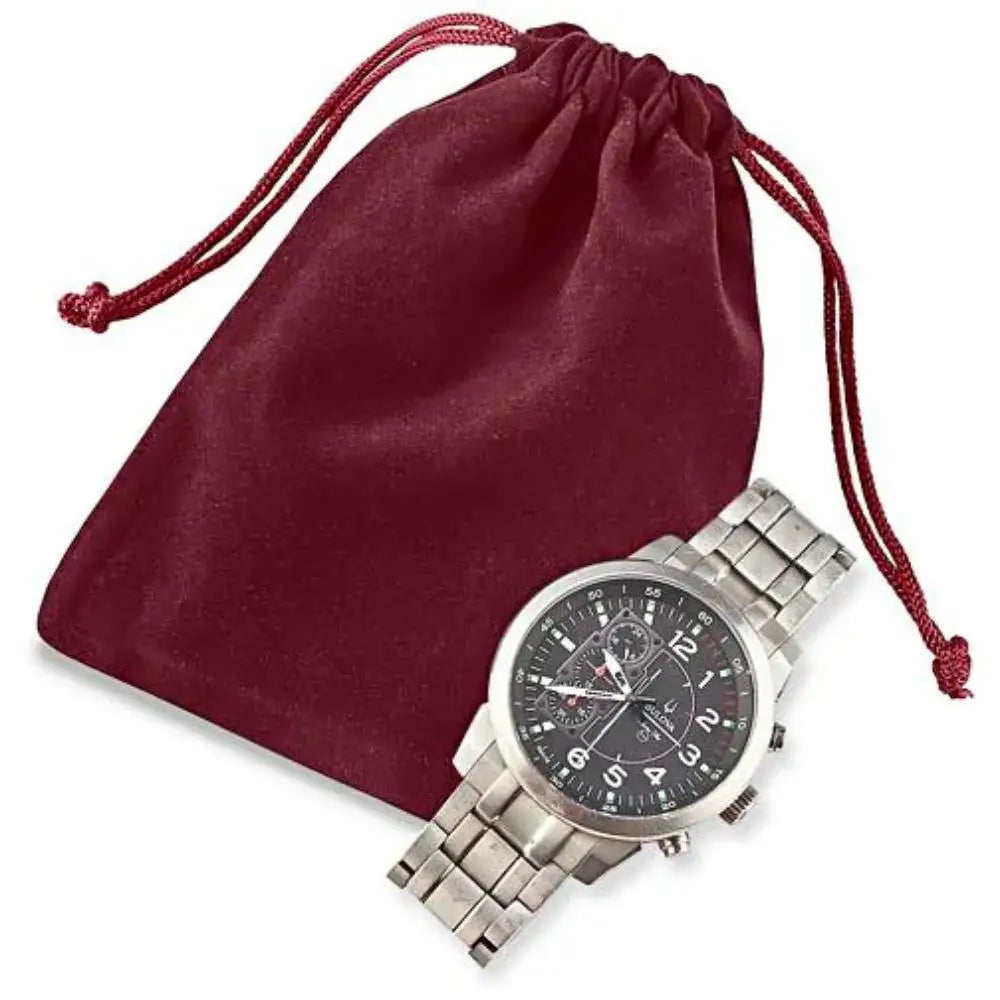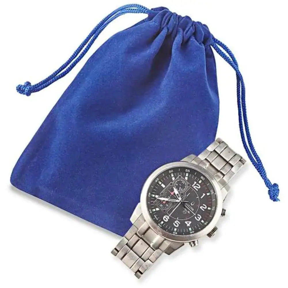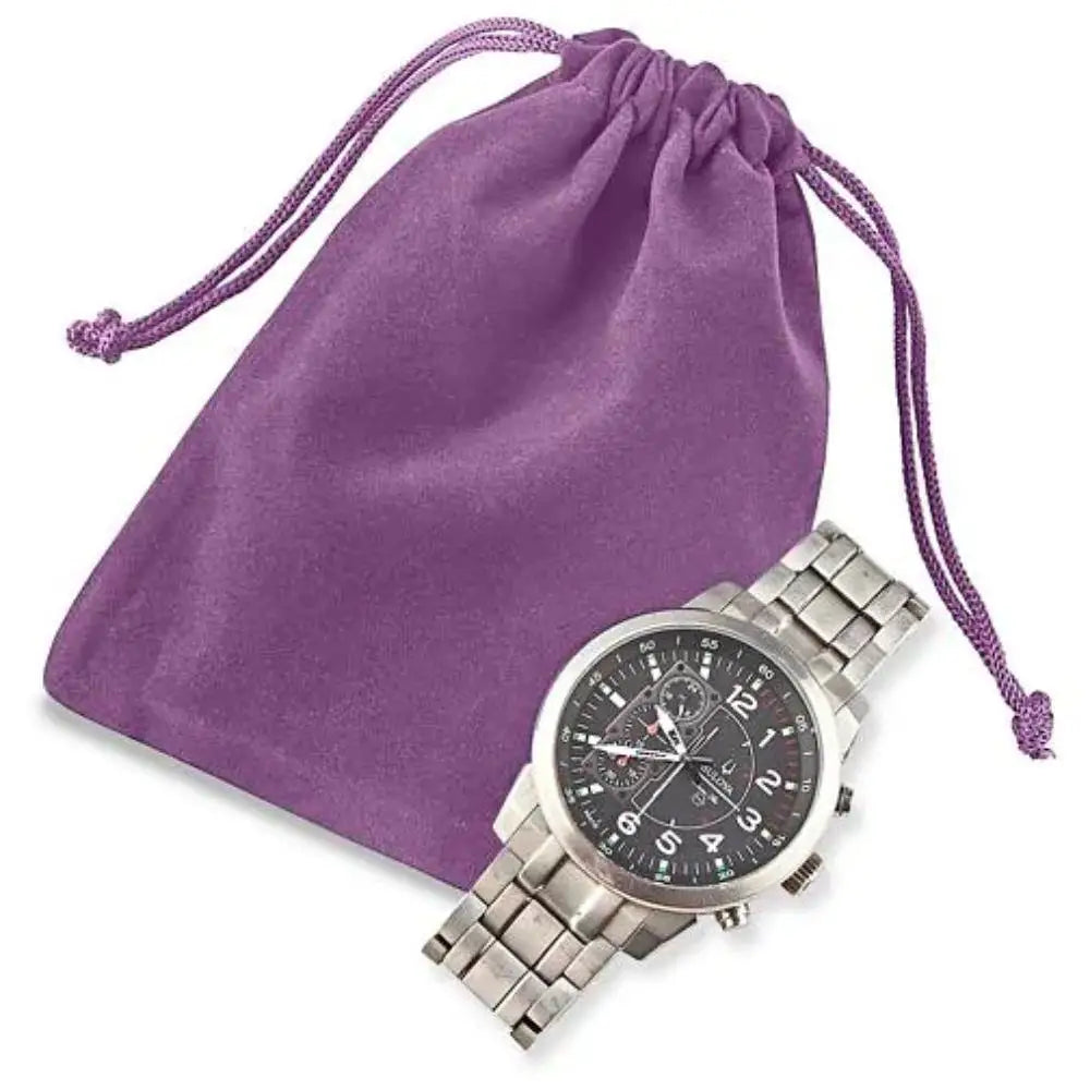 Double cord drawstring pulls velour bag tight for a snug, sure closure. Unlined, non-scratching interior. Dimensions are measured when velour bag is lying flat.
