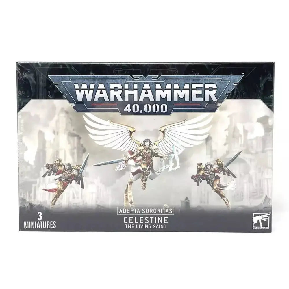 This multi-part plastic kit contains the components necessary to assemble Celestine, the Living Saint, and her 2 accompanying Geminae Superia. She wears the Armour of St. Katherine, a set of glorious golden plate replete with holy icons and sculpted symbols. The model is held aloft from the base by a scripture that attaches to her billowing cloak – even this detail is dwarfed by the enormous wings that span out from her backpack, with a spiked iron halo above her enraptured face. The sparking Ardent Blade in her right hand blossoms with roses, even as a brace of doves is released on her left. She is accompanied by the Geminae Superia, wearing similar armour (with smaller wingspans) and aggressively wielding bolt pistols and power swords.